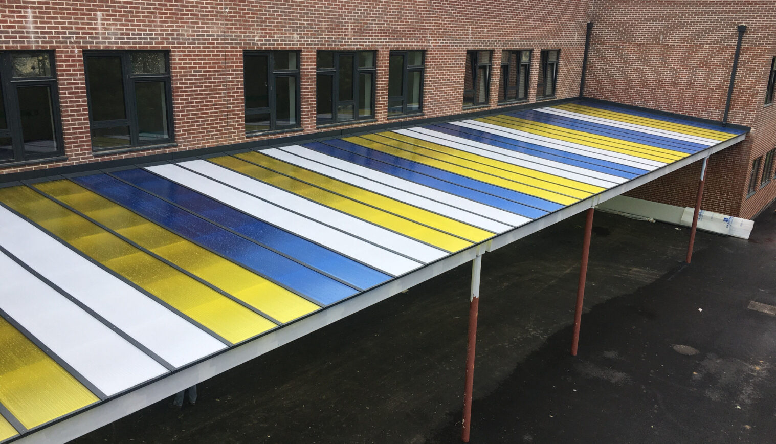 This recent installation at a school in Northampton was our first use of coloured polycarbonate. As you can see in the pictures the results are quite striking. The use of coloured polycarbonate allowed the colours of the new canopy roof to be matched to the Schools’ own corporate colours.