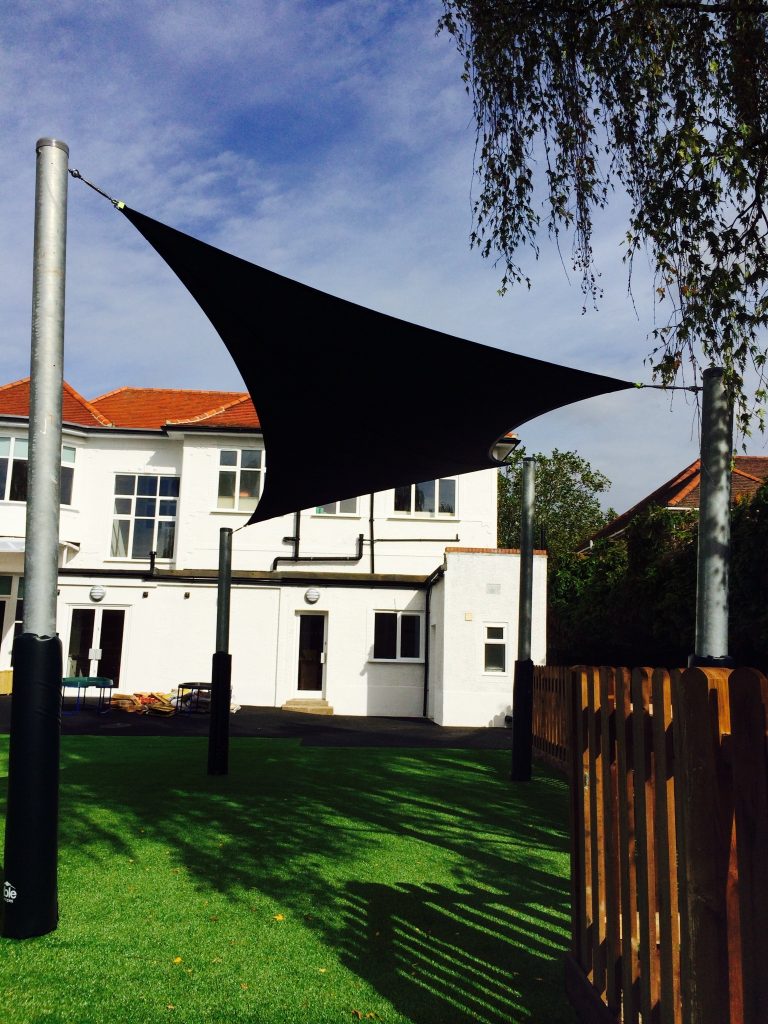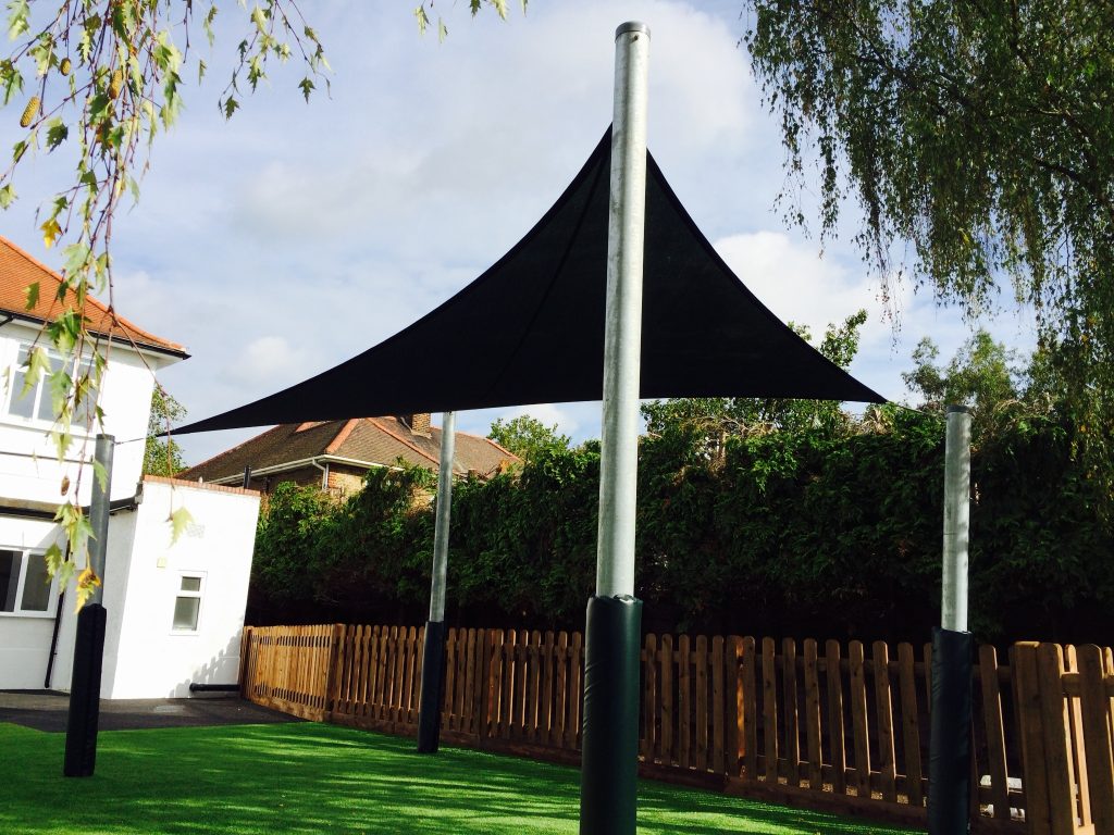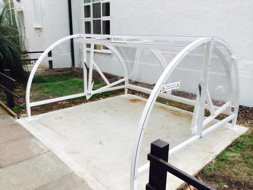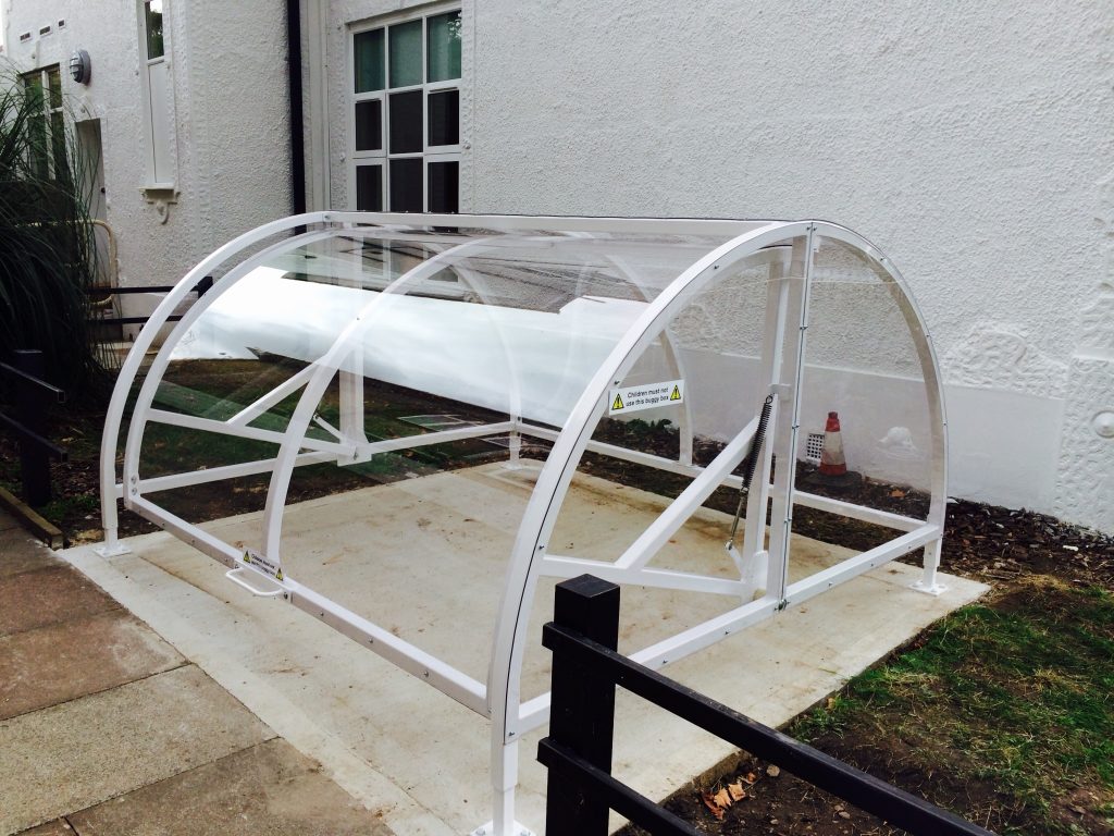 Arden House is a historic building in Barking, Essex, which was undergoing re-development by the local council (London Borough of Barking and Dagenham) in order to transform it into a day nursery for 120 local children. Part of the development included an entrance canopy, a buggy shelter and a shade sail for the outside play area. John Burke Associates had specified the products required and we were able to supply them as requested. The products supplied were an Ennerdale Walkway Canopy at the building’s entrance, a Bottle Green Shade Sail in the garden and a bespoke buggy shelter to the side of the building which can store up to 4 buggies.