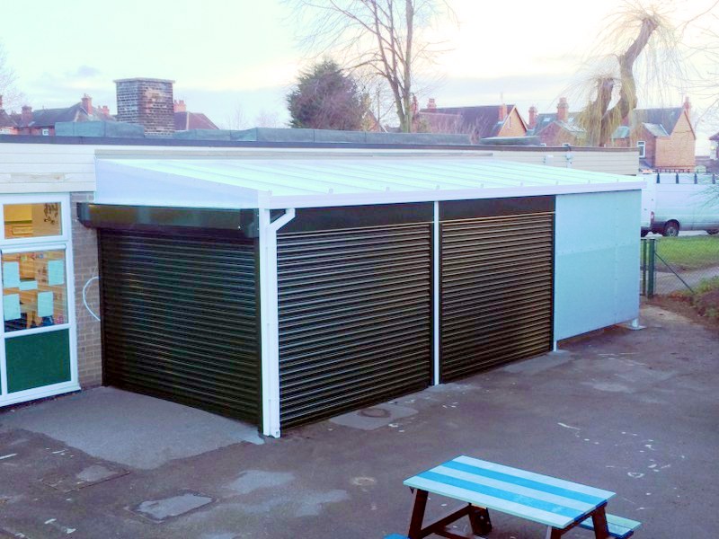 We supplied and installed a Coniston Wall Mounted Canopy with one 35mm polycarbonate side fill to create additional protection from the wind. We returned to site after these images were taken and installed 3 roller shutters to the canopy to enable the school to store outside play equipment securely, overnight.