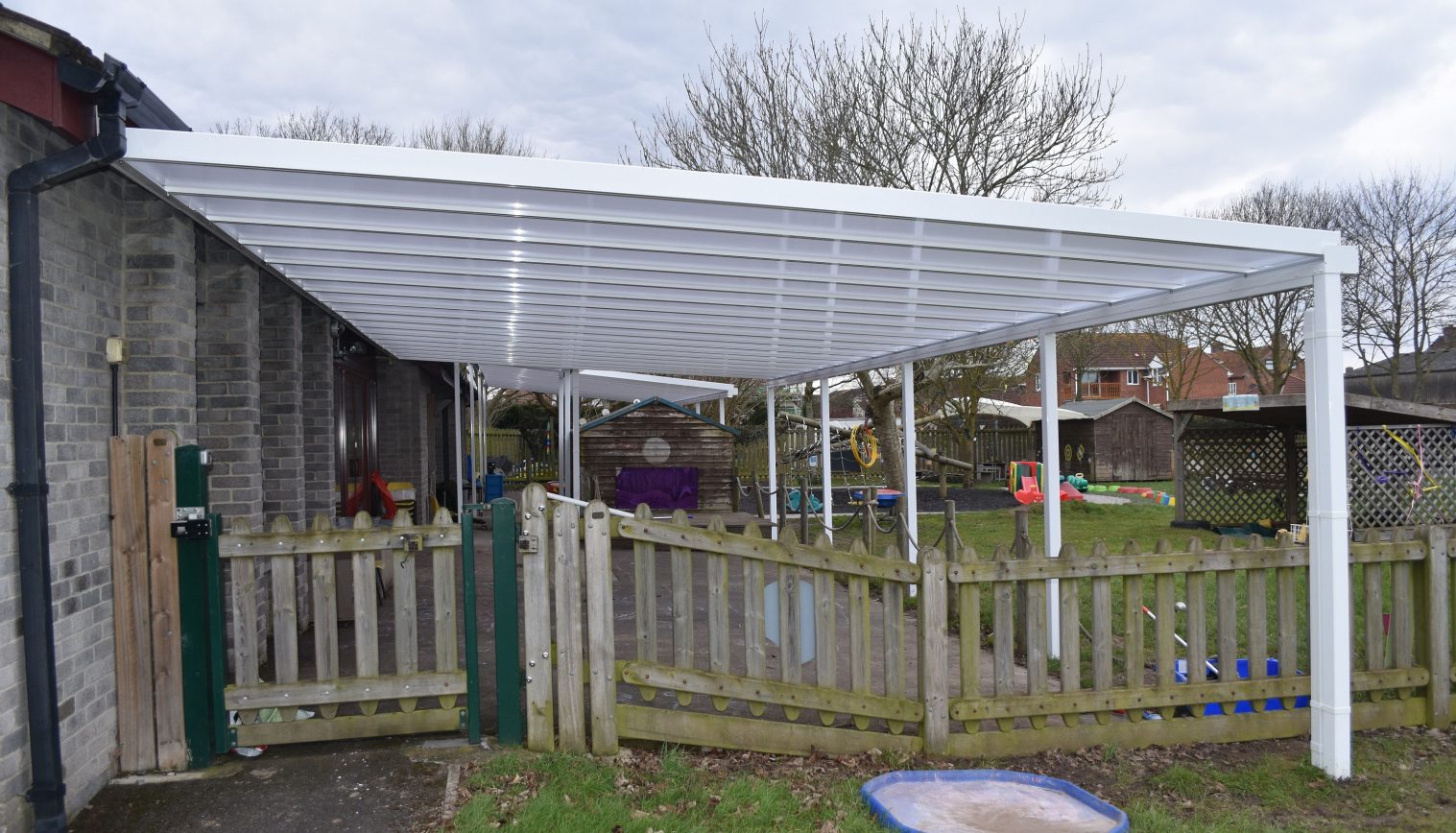 To meet the schools requirements, we installed three Coniston Wall Mounted Canopies, two on rear goalpost frames. The Coniston creates shelter from rain and snow and shade from the sun with high UV protection.