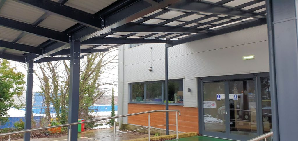 The Kensington Dual-Pitch Free Standing Canopy is a free-standing canopy that is ideal for private and public sector buildings including schools, colleges, universities and retail as this canopy offers many different functions including walkways, waiting areas and much more. This would meet Bobaths Children Centre’s requirement as they were in need of an area outside that is sheltered that would allow the children to go outside for activities and be protected from the elements but also offers a protected waiting area for the children and parents whilst waiting for their appointment.