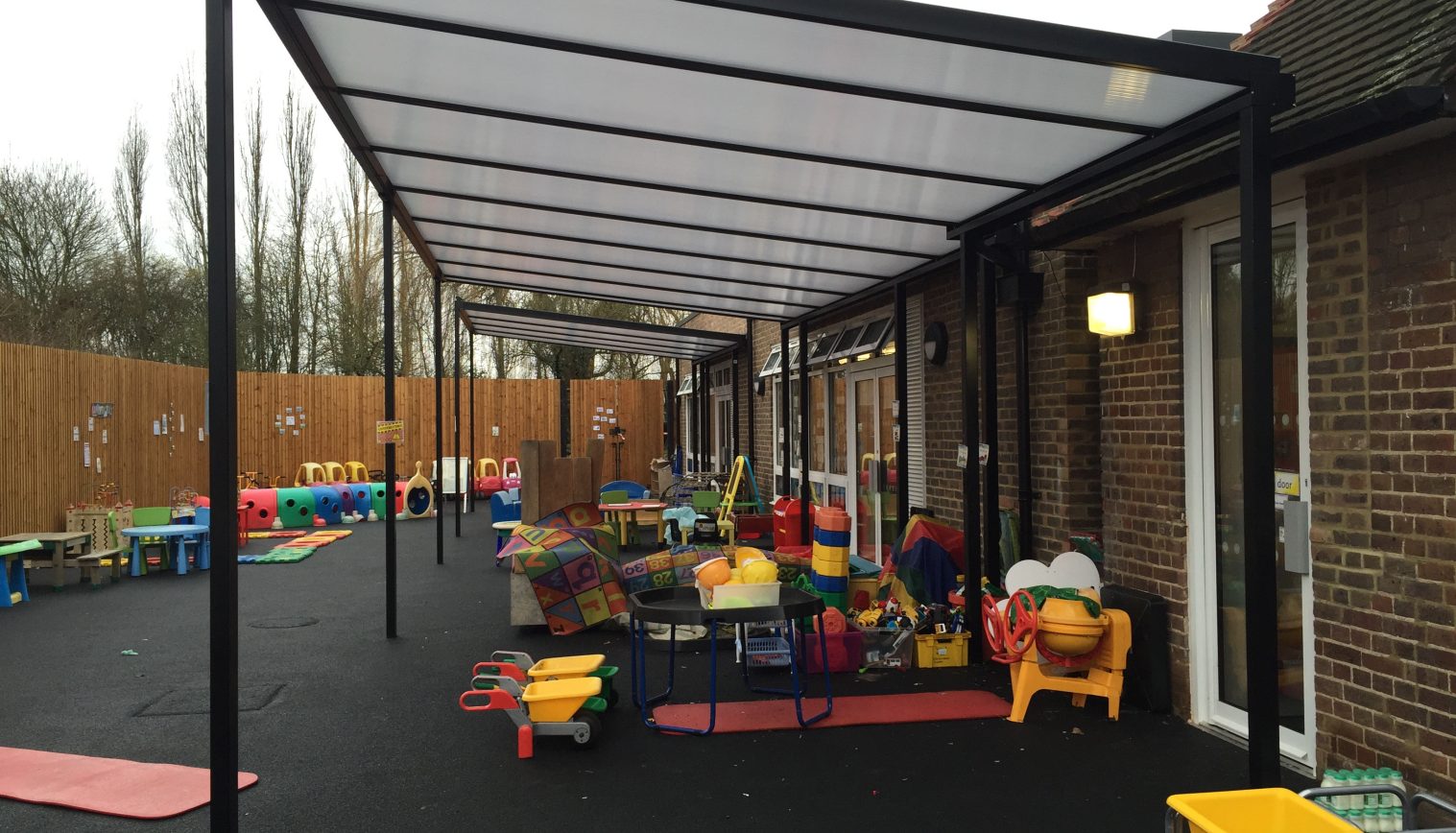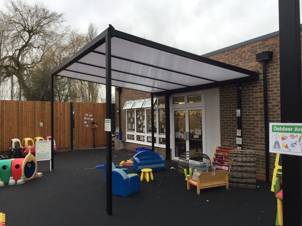 We installed two Jet Black Coniston Wall Mounted Canopies on Rear Steel Golf Posts as their building was not suitable to support a wall mounted canopy. The children can now play and learn outside come rain or shine and enjoy the benefits that the outdoors offers to Early Years and Primary education.