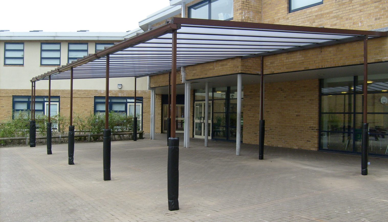 Our installation team installed a 13.5m x 6m Coniston Wall Mounted Canopy at Chapel-en-le-Frith High School. The school chose the frame of the canopy to be coloured Woodgrain this matched some of the school’s surroundings. The canopy created a large covered outdoor area to an entrance area of the building.