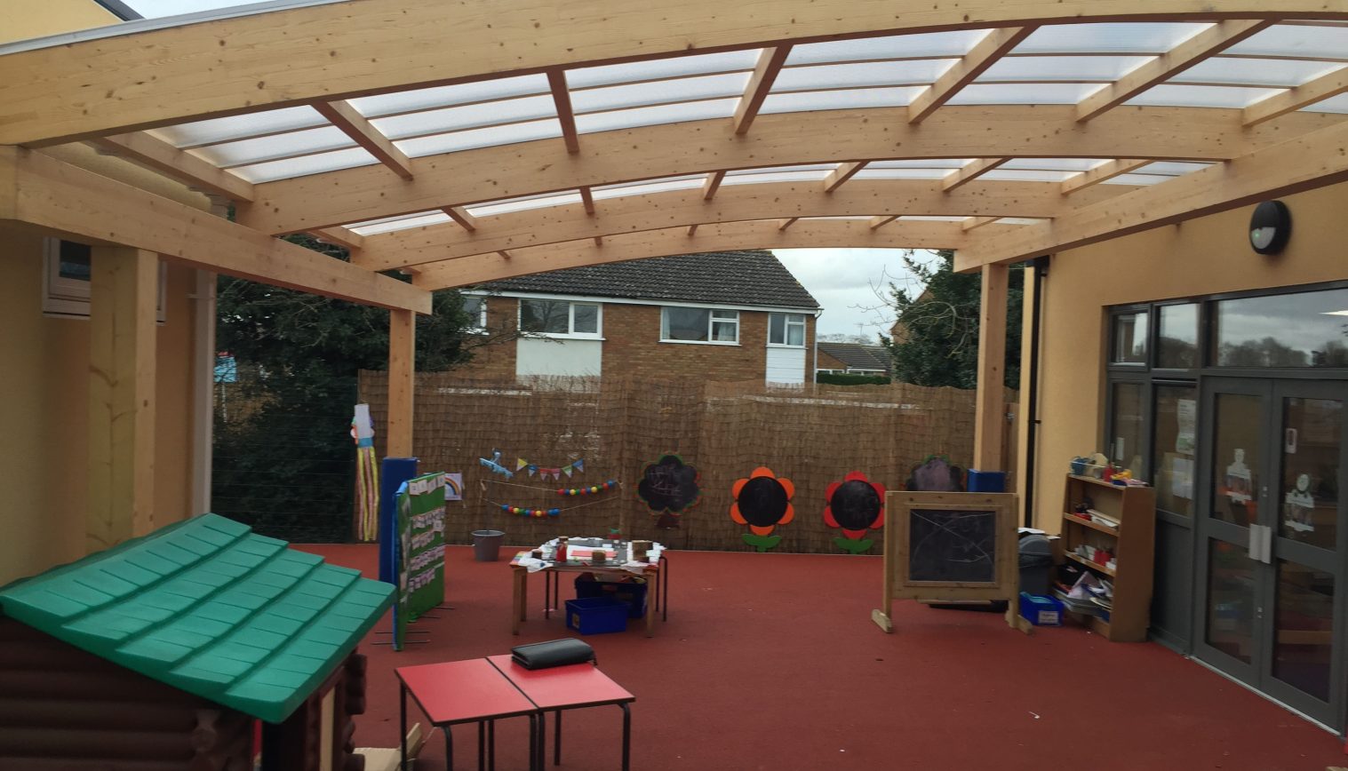 We installed a 7.7m x 6.3m Tarnhow Curved Free Standing Canopy creating a large outdoor covered area allowing the children to enjoy the outdoors all year round. We also installed a 2.3m x 1.2m Beck Entrance Canopy creating shelter over an entrance area.