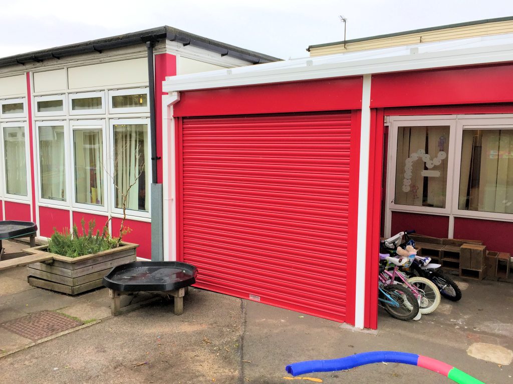 Our fitting team installed a 7.7m x 3m Coniston Wall Mounted Canopy with Roller Shutters in the colour strawberry red as an optional extra. By adding roller shutters to the structure, it can be made into a lockable storage area during the night and when not in use.