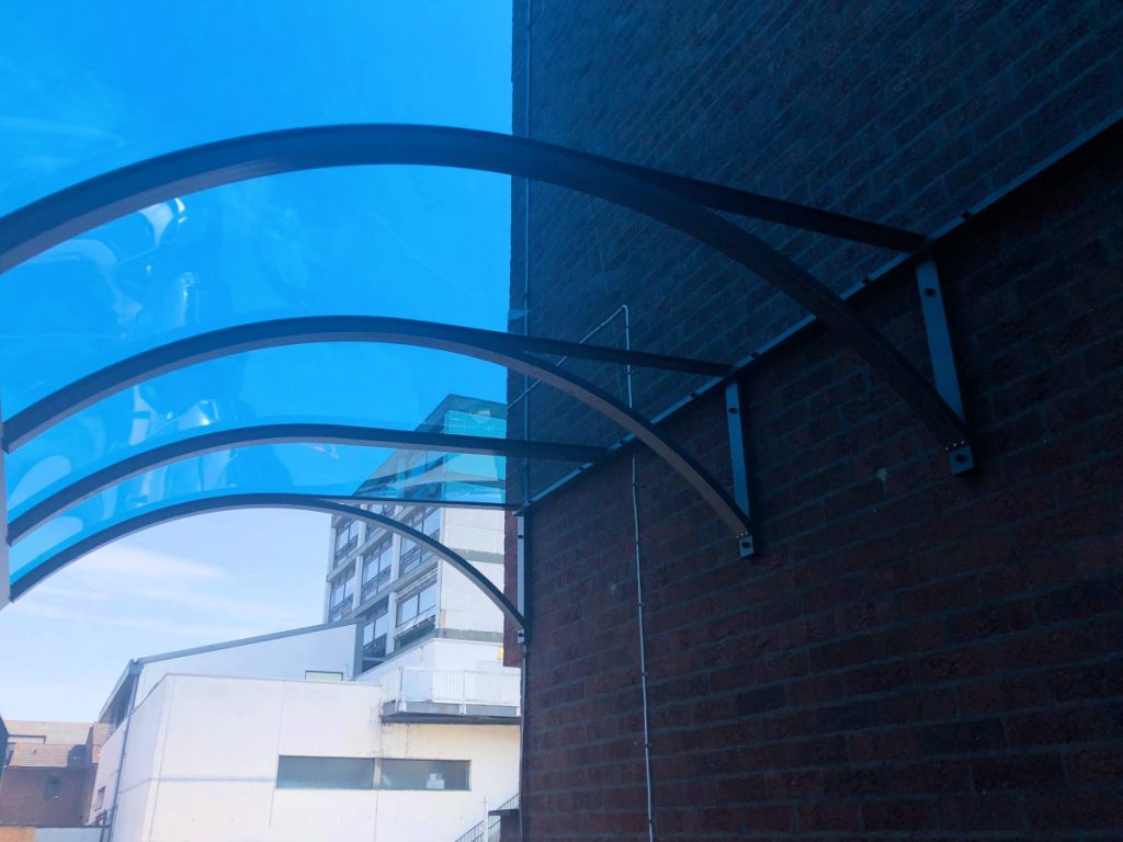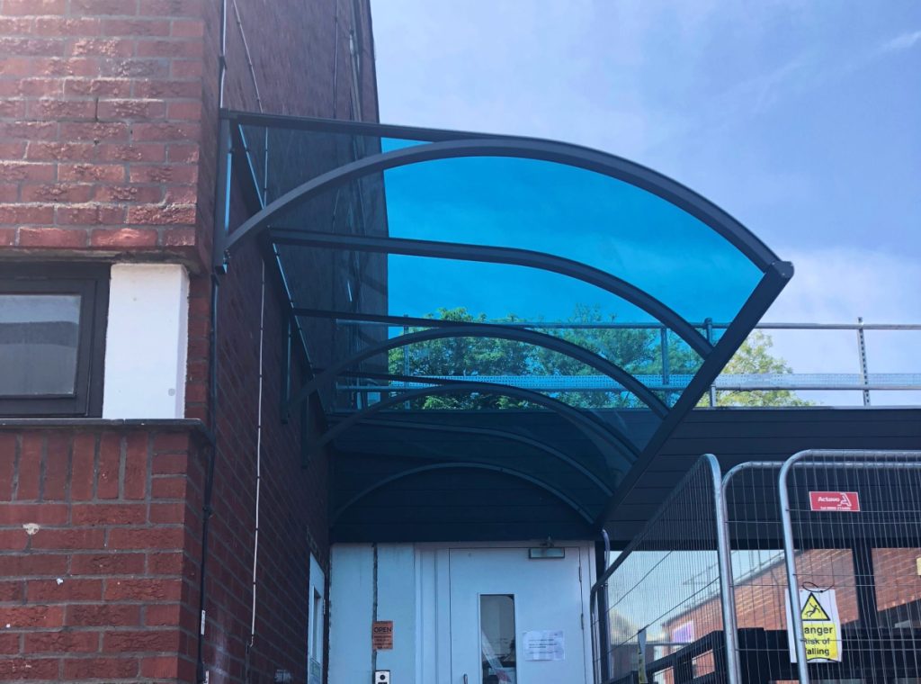 In July 2018, we suppiled and installed a 3.95m x 2m Orwell Entrance Canopy in marbled grey with a blue coloured polycarbonate. We also installed a Abberton Entrance Canopy.