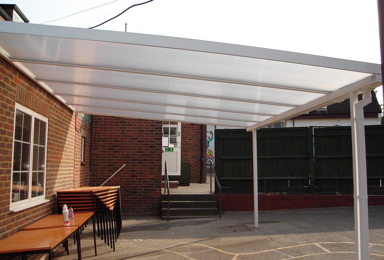 We installed a 4.8m x 4m Coniston Wall Mounted Canopy at Fetcham Village Infant School, creating a covered outdoor area. This allows the pupils to play outdoors throughout the whole year due to the high weather protection that the Coniston from the rain, sun and snow.