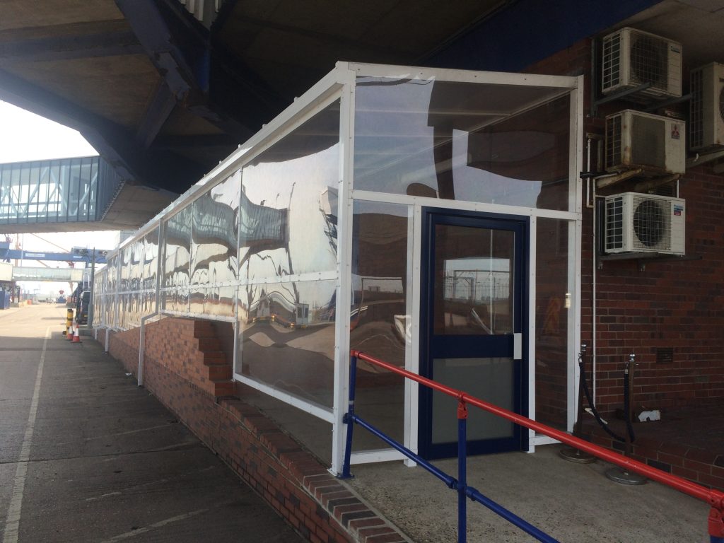 We supplied and installed a Coniston Wall Mounted Canopy as this product met the design and specification requirements of Harwich International Port and has an unlimited length so it could easily achieve the large length required. We installed the Coniston with a number of 5mm solid polycarbonate side, front and back fills, along with a door for added protection. An additional 3m x 3m Coniston Wall Mounted Canopy was also installed, connected to the large canopy to provide shelter to the trolley area.
