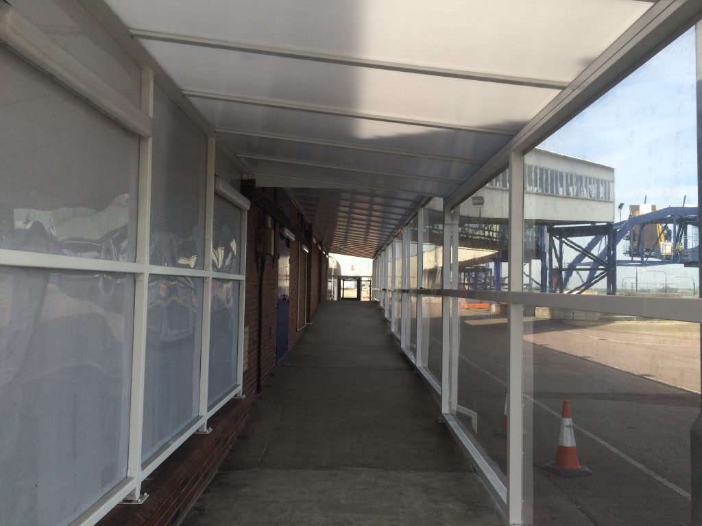 Harwich International Port were in the process of making improvements to their bus loading access area and required a covered walkway to complete the project. They required a canopy that could span the required length of approximately 35m and that could be enclosed with polycarbonate sheeting on the roof as well as the sides, front and back.