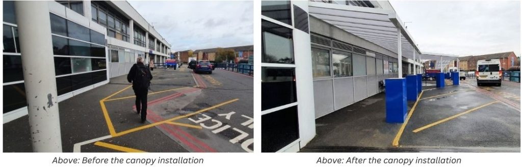 The canopy was installed over the space of 10 days and included night, day and weekend work to accommodate keeping key sections of the hospital open whilst the canopies were being installed.