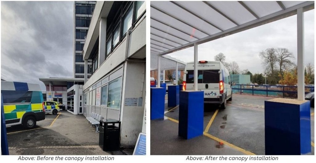 The project, which was managed by Kier Construction and Blue Iris Partnerships, included a number of canopies along the entrance to their emergency department where patients and ambulances arrive 24/7.
