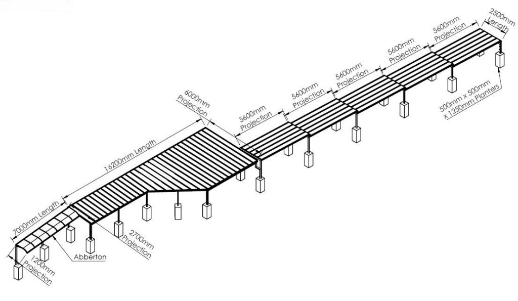 The Coniston Wall Mounted Canopy posts usually require installation into concrete pads below the surface of the ground however, due to the ramp being elevated with no possibility of digging foundations, these needed to be surface mounted. We therefore used steel planters measuring 500mm x 500mm x 1250mm filled with concrete to combat this issue. All calculated by the structural engineer to ensure the canopies complied to wind & snow loadings.