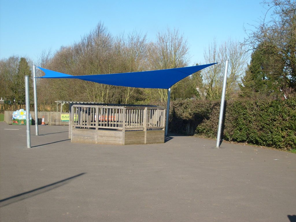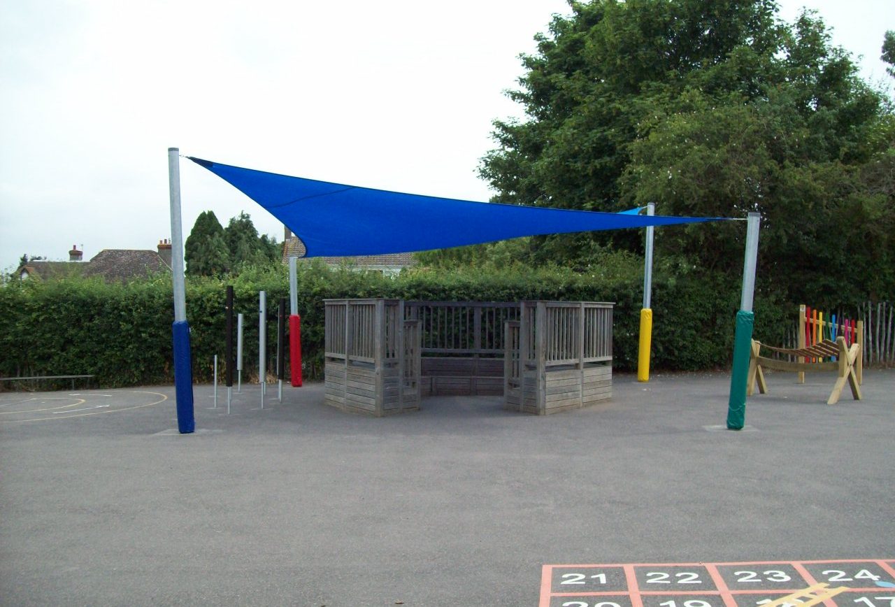 We installed a 7m x 7m Shade Sail with blue fabric to shade the whole of the seating area and protect the pupils from the sun. The school also had four different coloured post pads to add further style and protect the children from bumping into the posts.
