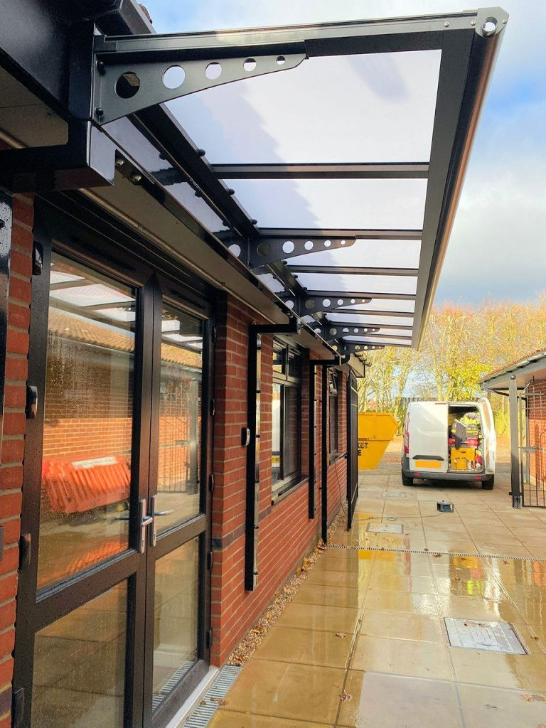 Crofton Interiors Ltd were working on a project at Mendlesham Community Primary School in Suffolk which involved us installing a 5.3m x 0.9ma Tenby Entrance Canopy on Goal Posts to the main entrance of the school building providing shade and shelter to all weather conditions.