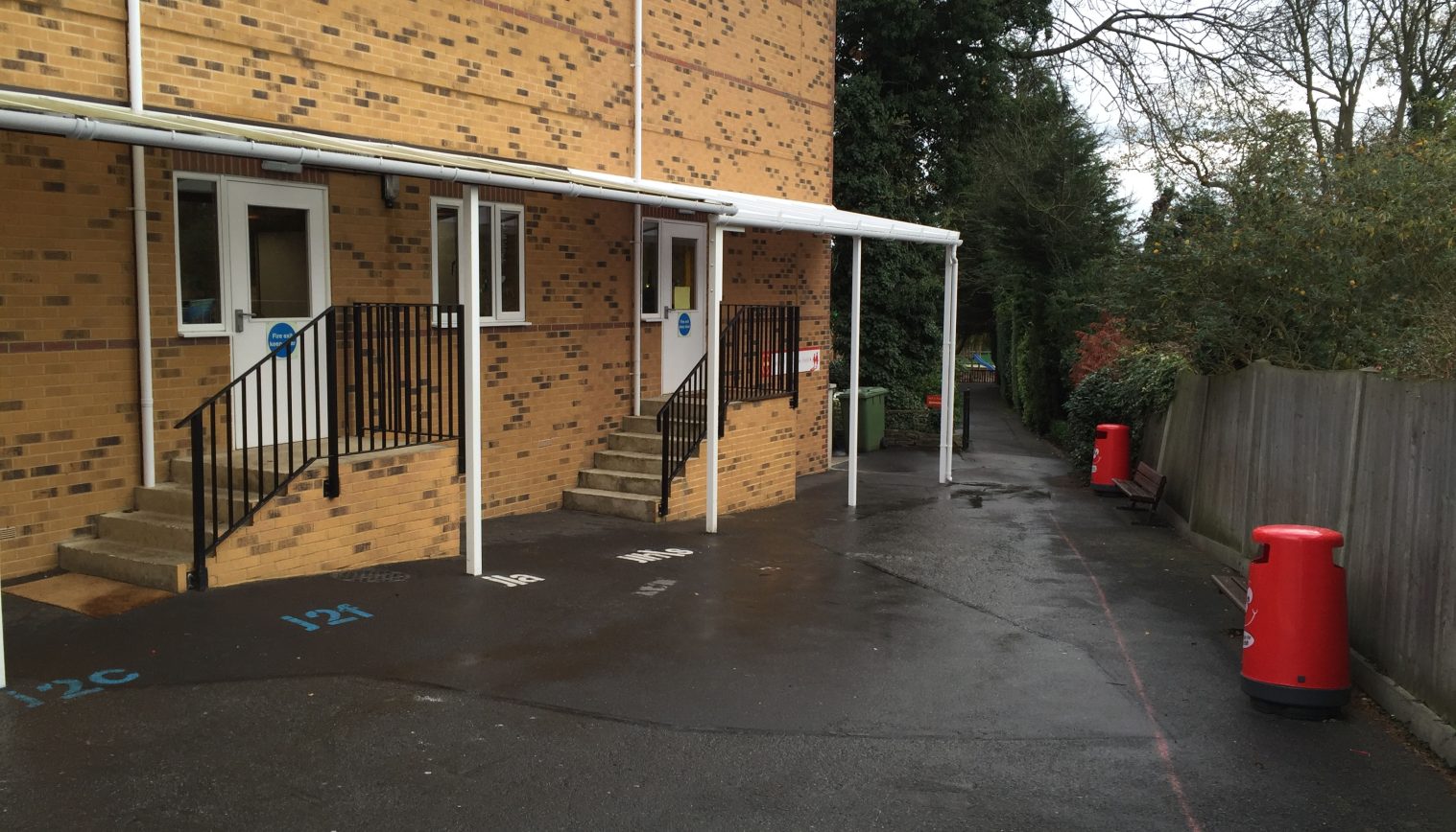 We installed a 6.5m x 2m Coniston Wall Mounted Canopy covering the fire exits at the rear of the building.