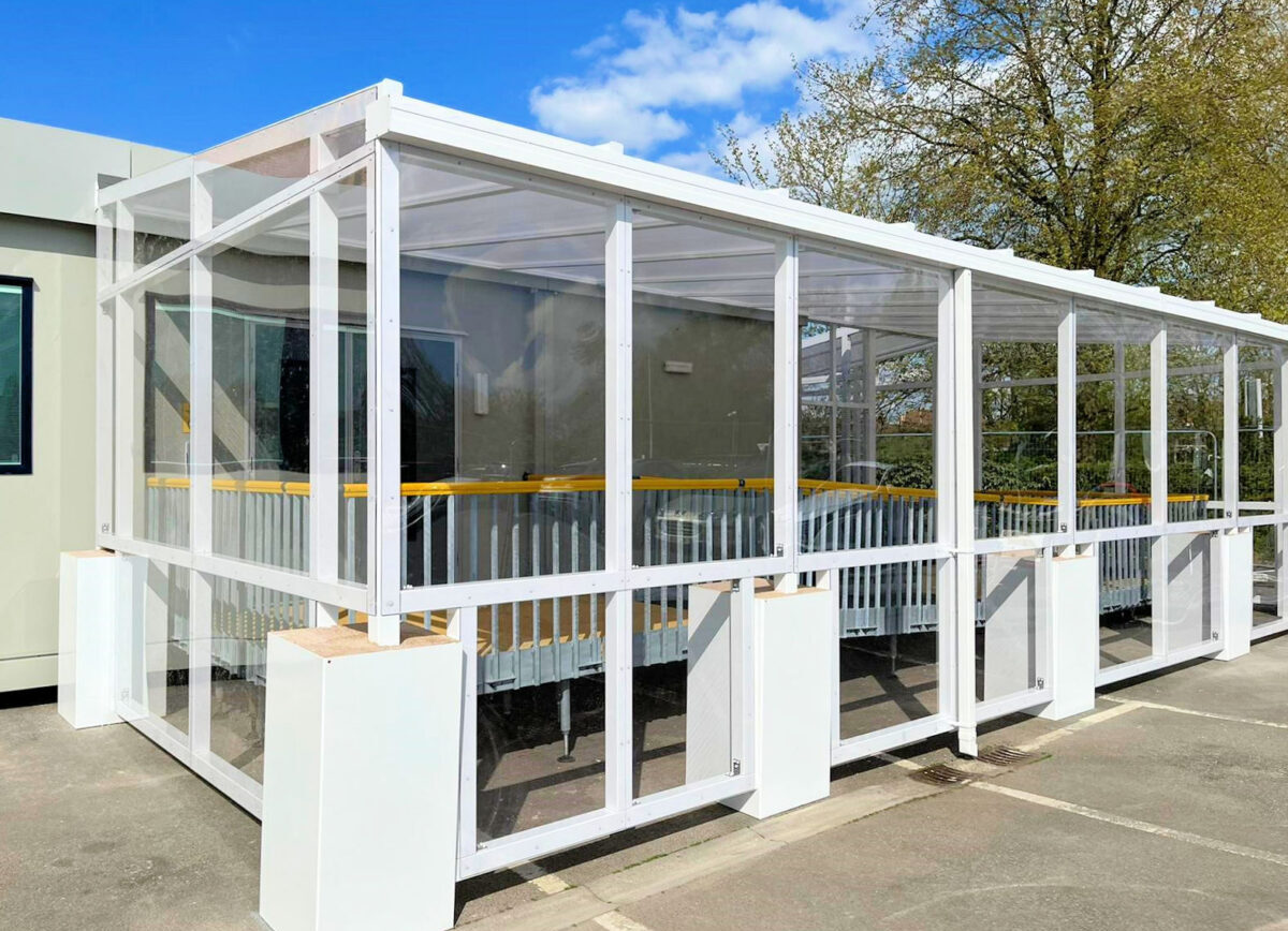 Able Canopies Ltd supplied and installed various Coniston on Rear Steel Goal Posts with side and front fills at Musgrove Park Hospital created covered walkways and waiting areas at the hospital.
