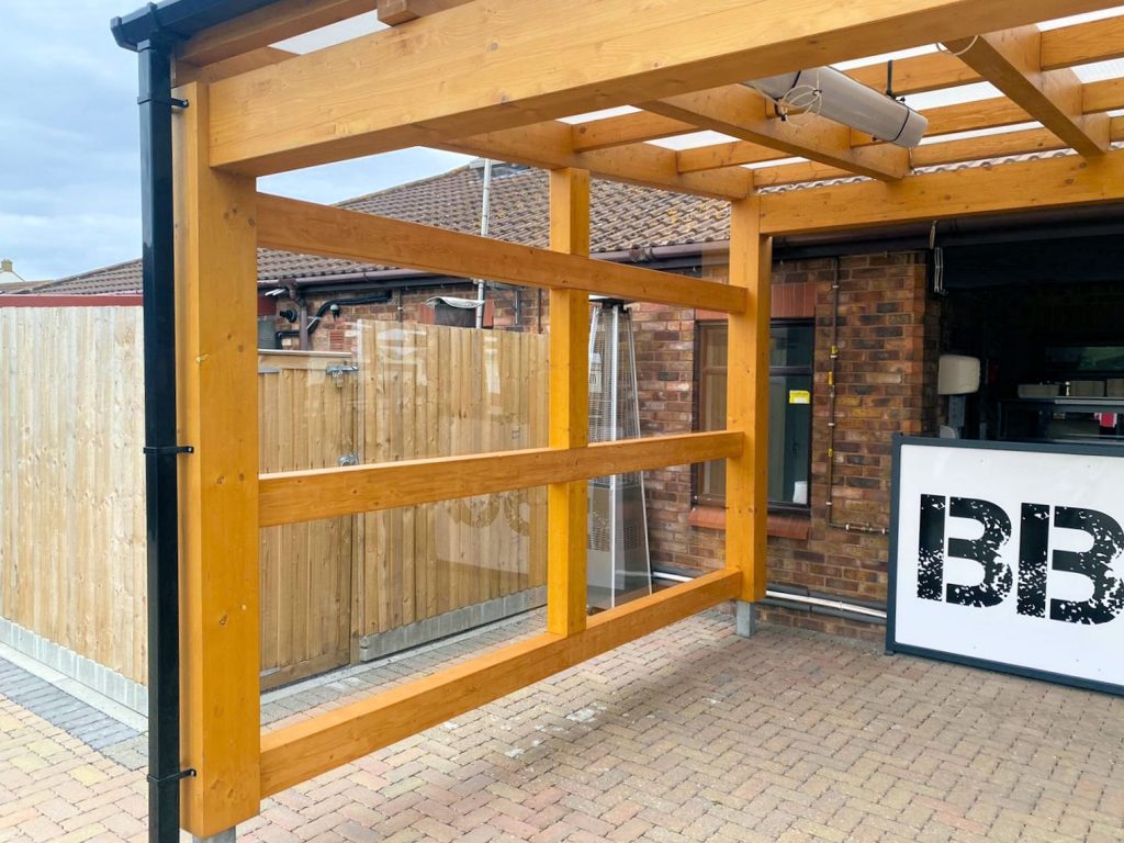 They were looking to create a covered outdoor dining area that could cater for a large number of guests whilst keeping a safe distance in the current circumstances. the side extension of the Tarnhow Mono Free Standing Timber Canopy is for the staff to use as an outdoor BBQ area.