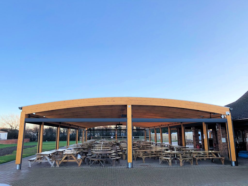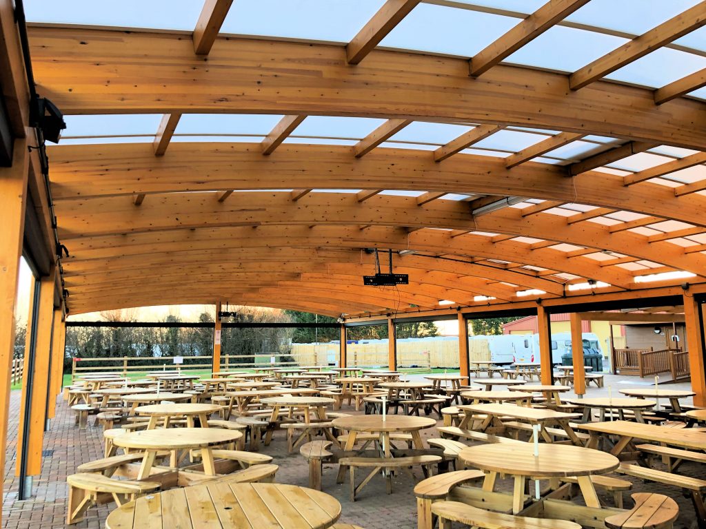 In March 2021, we supplied and installed a 30m x 12m Tarnhow Dome Free Standing Timber Canopy connected to a 6m x 4m Tarnhow Mono Free Standing Timber Canopy with side fill at Northam Farm Holiday Park in Somerset.