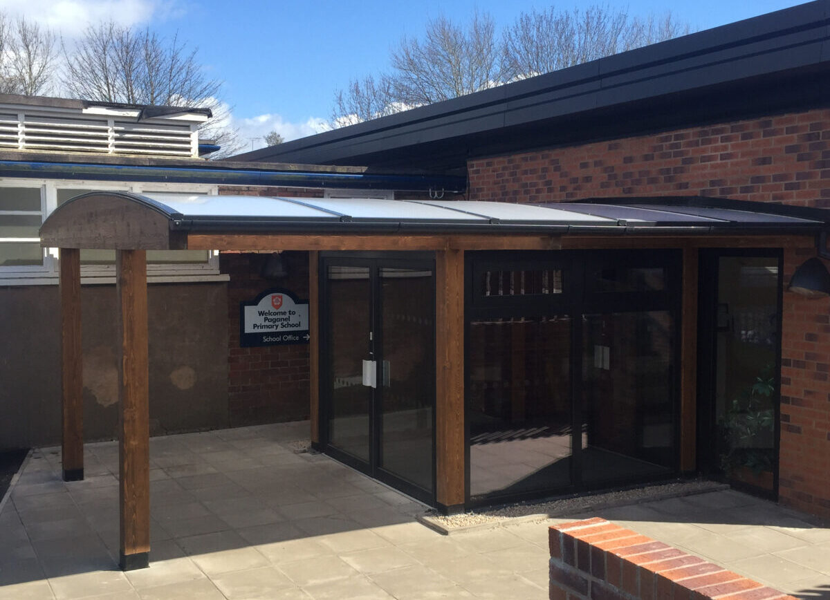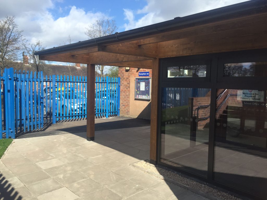 Morgan Sindall Group PLC were working on a project at Paganel School in Birmingham and they required two canopies to be installed in the school grounds. They had specified our Grange Junior Free Standing Canopy to cover their outside Nursey area, please click here to find out more about the Nursery installation. They also required a bespoke Tarnhow timber canopy to be installed at their main entrance.