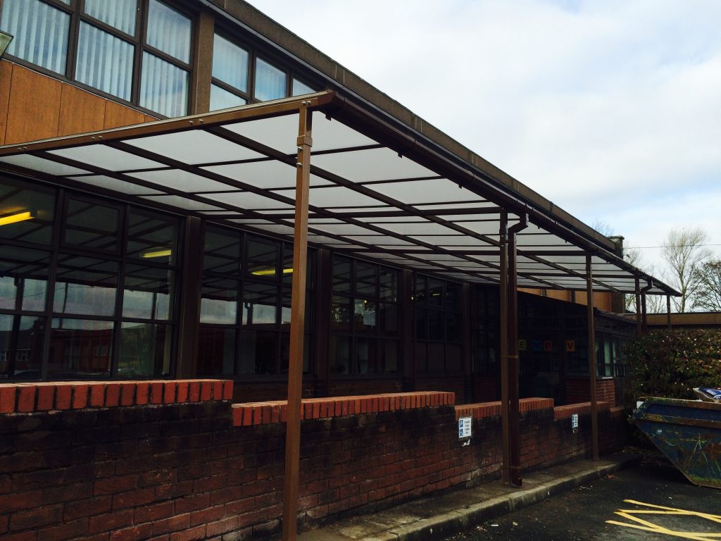 We supplied them with a 12.5m x 4.7m Grange Junior Free Standing Canopy finished in Pale Brown (RAL 8025) to match their existing window frames and to provide effective cover from the weather.