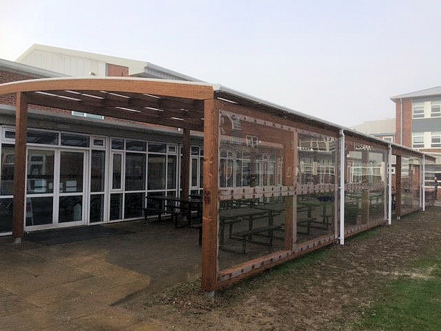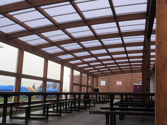 In December we installed a 22m x 6m Tarnhow Curved Free Standing Canopy with 5mm Clear Solid Poly Front Fills to the college which created an attractive enclosed covered seating area that can be used throughout the whole year.