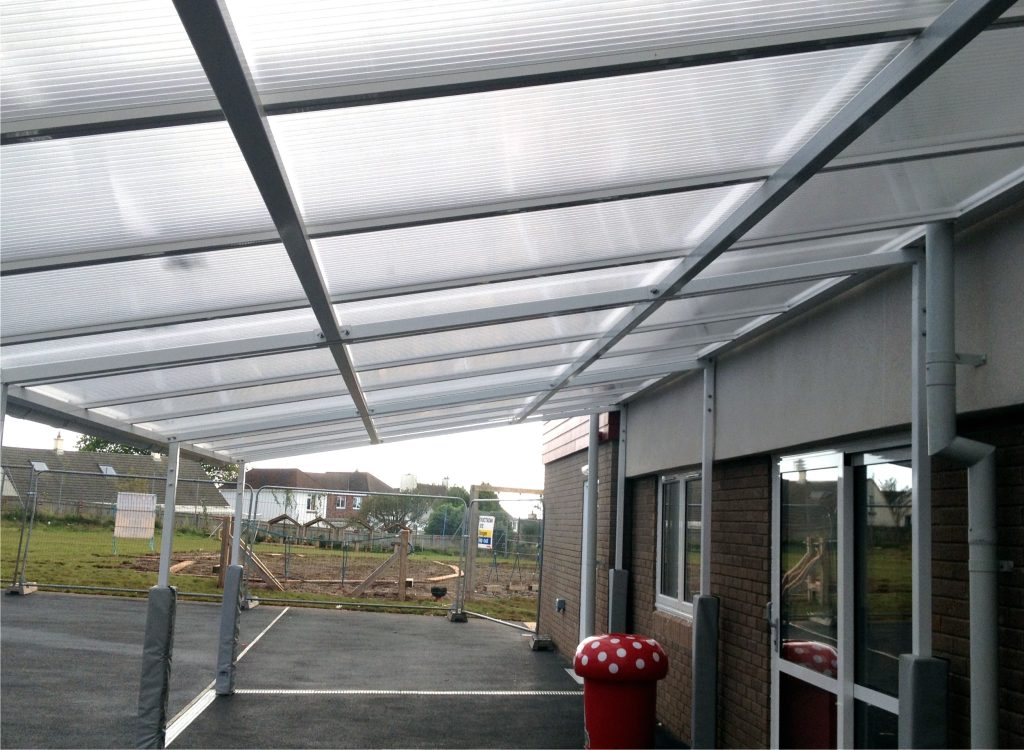 Able Canopies suggested the Grange Junior Free Standing Canopy as the ideal shelter solution for them due to its similar appearance to the Coniston Wall Mounted Canopy, and the fact it also shared many of the Coniston’s benefits including its ability to be constructed to an unlimited length. As a free standing structure the Grange Junior does not need to be fixed to a building or other structure which matched Preston Primary school’s needs. It benefits from a robust steel frame which is covered with polycarbonate roof panels that offer high UV protection from the sun, making this product ideal for an educational environment.
