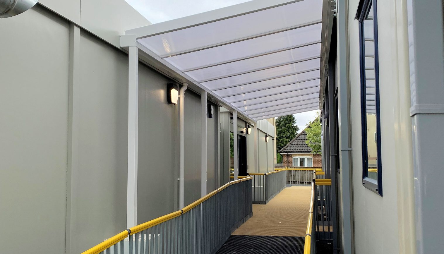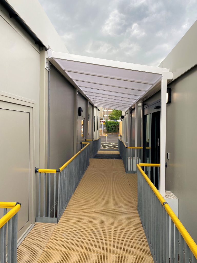 In July 2021, we supplied and installed a 10.1m x 2.8m Coniston Wall Mounted Canopy with planters at Southampton University Hospitals NHS Trust in Hampshire on behalf of Portakabin. The canopy will provide shade and shelter to the entrance of building.