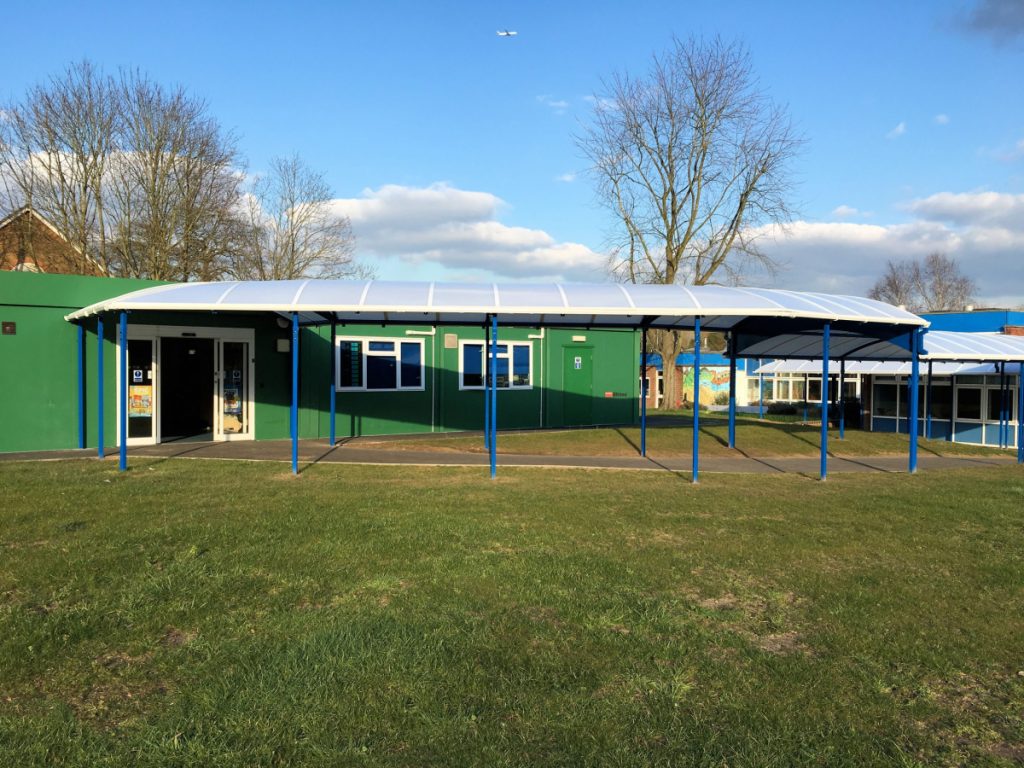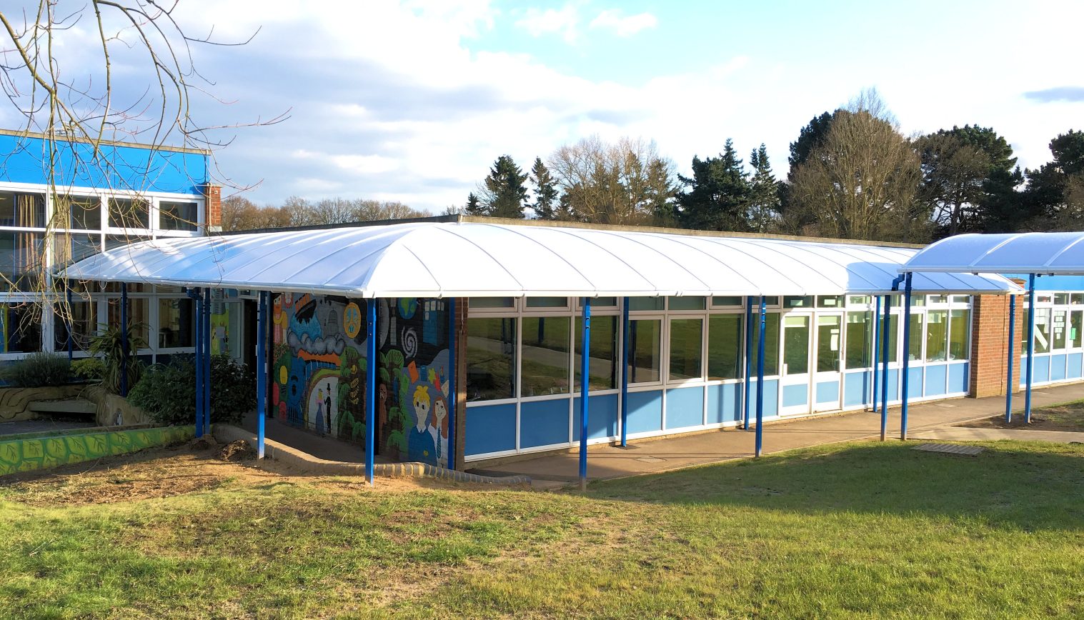In February 2016, we installed a 20.5m x 2.5m Devoke Junior Free Standing Canopy creating a covered walkway around the building to keep pupils sheltered whilst playing outside and to stop unwanted heat and glare from shining inside the classrooms. The installation also included a 30.5m x 4m Welford Junior Dome Walkway, creating a covered walkway between the main building and an outbuilding ensuring staff, pupils and visitors are protected from the worst of the elements.