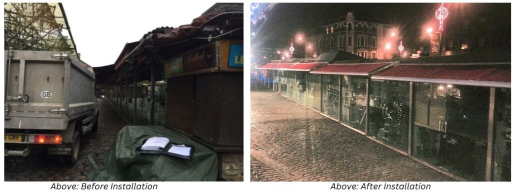 The awnings were installed in two phases during the night time to avoid disruption to the daily running of the market. A night time installation enabled the businesses to stay open and avoid any disruption or loss of custom during their regular opening hours.