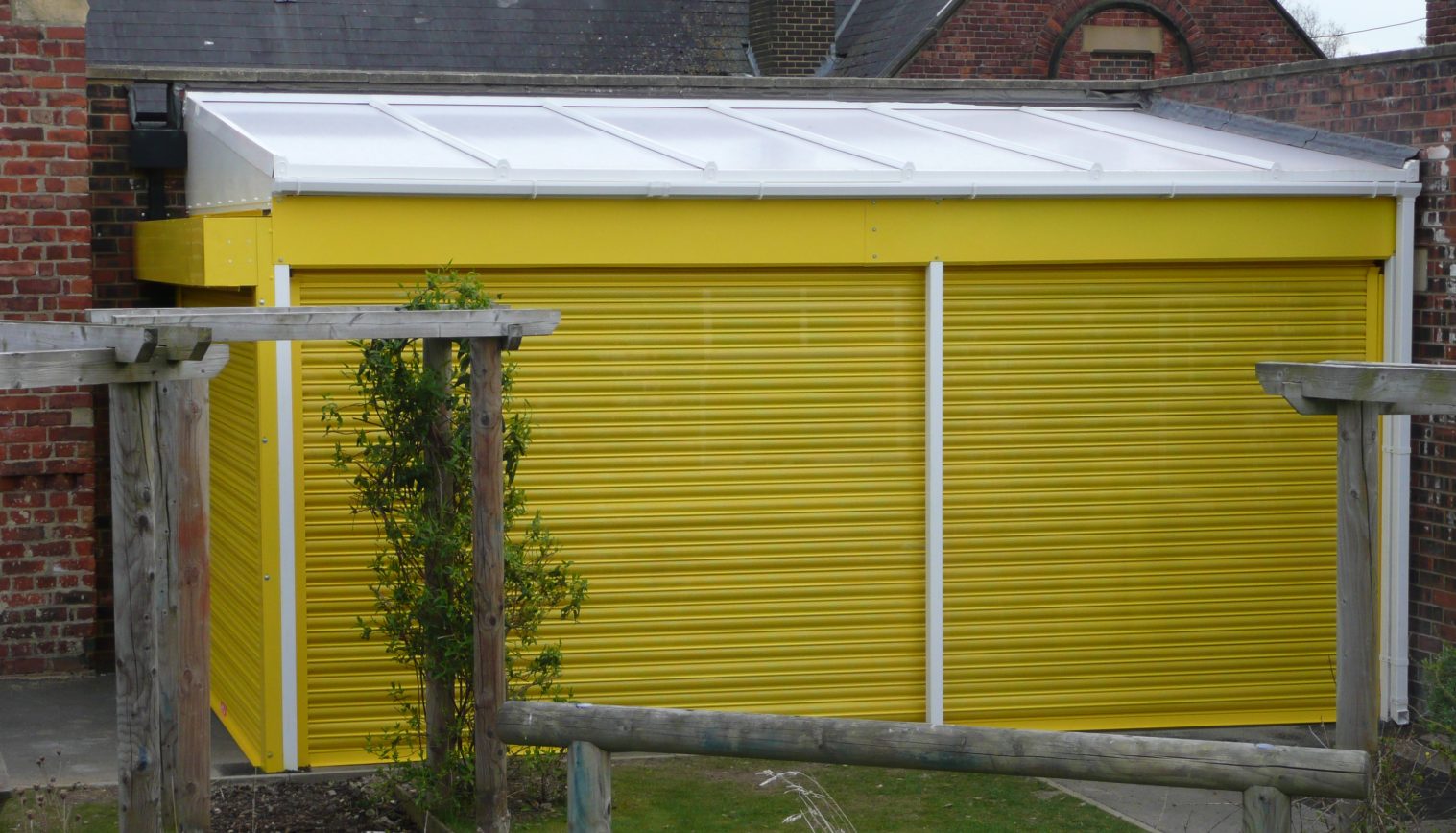 Wall Mounted Canopy with Secure Roller Shutters installed in Crook: