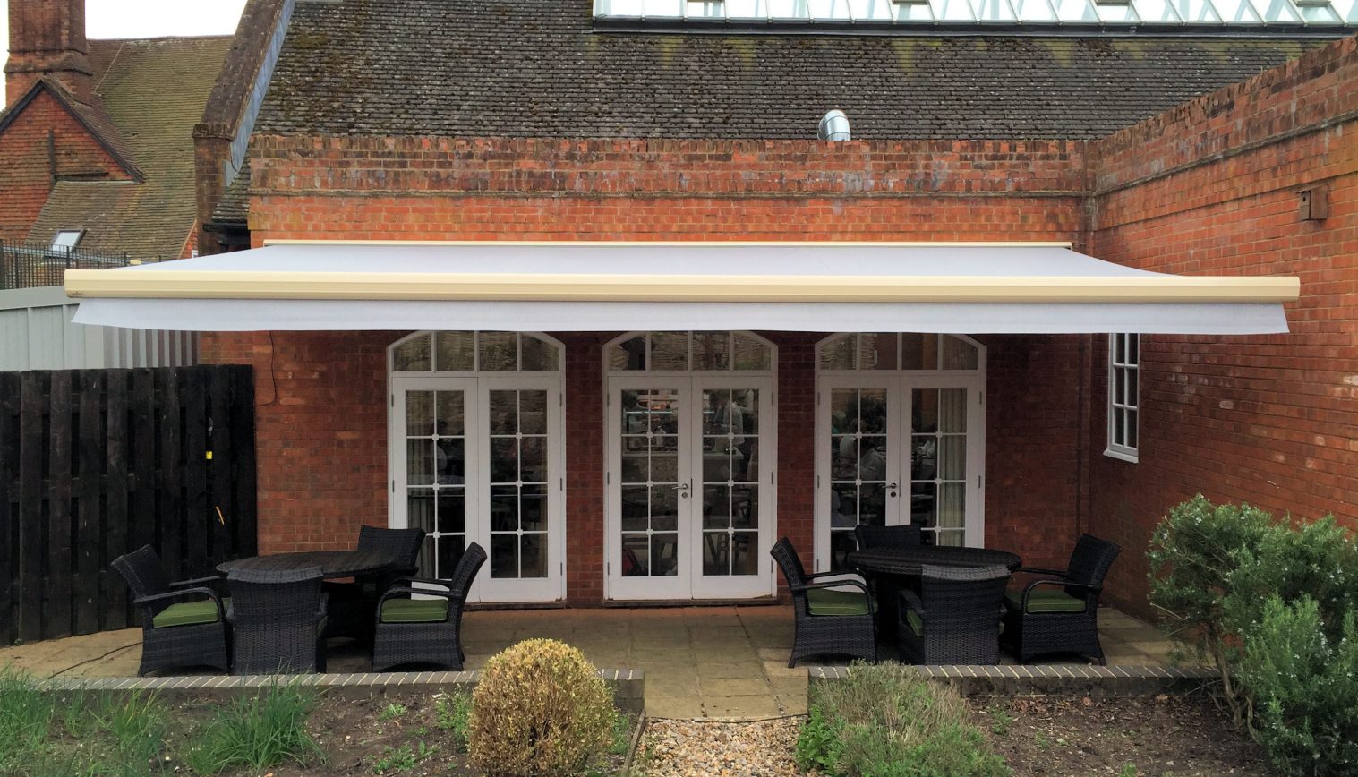 Able Canopies’ full cassette awnings are contemporary, retractable awnings that have been designed for well used, busy outside spaces. They can be opened and closed with the touch of a button using the remote control supplied or, alternatively we can supply the awning with a manual hand crank instead for those that would prefer not to have electronic controls.