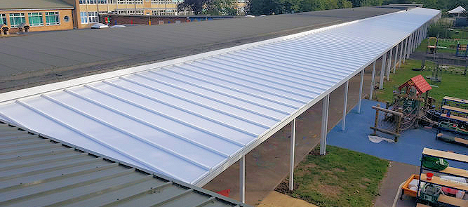 Find out more about the Coniston Wall Mounted Canopy with 5mm Solid Polycarbonate Side Fills that we installed at Burpham Primary School in Guildford, Surrey: Wall Mounted Canopy with Side Fills