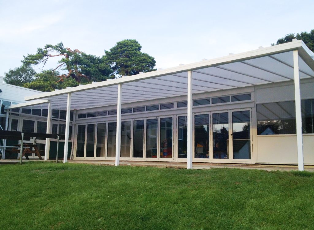 In 2013, we installed a 13.7m x 4m – 5m Coniston Wall Mounted Canopy at Abbots Hill Primary School, creating a large shaded outdoor area. The Coniston canopy offers up to 99% protection from the UV rays and also come with a 10 year guarantee and a 25 year life expectancy, ensuring it will provide the school with protection for many years to come.
