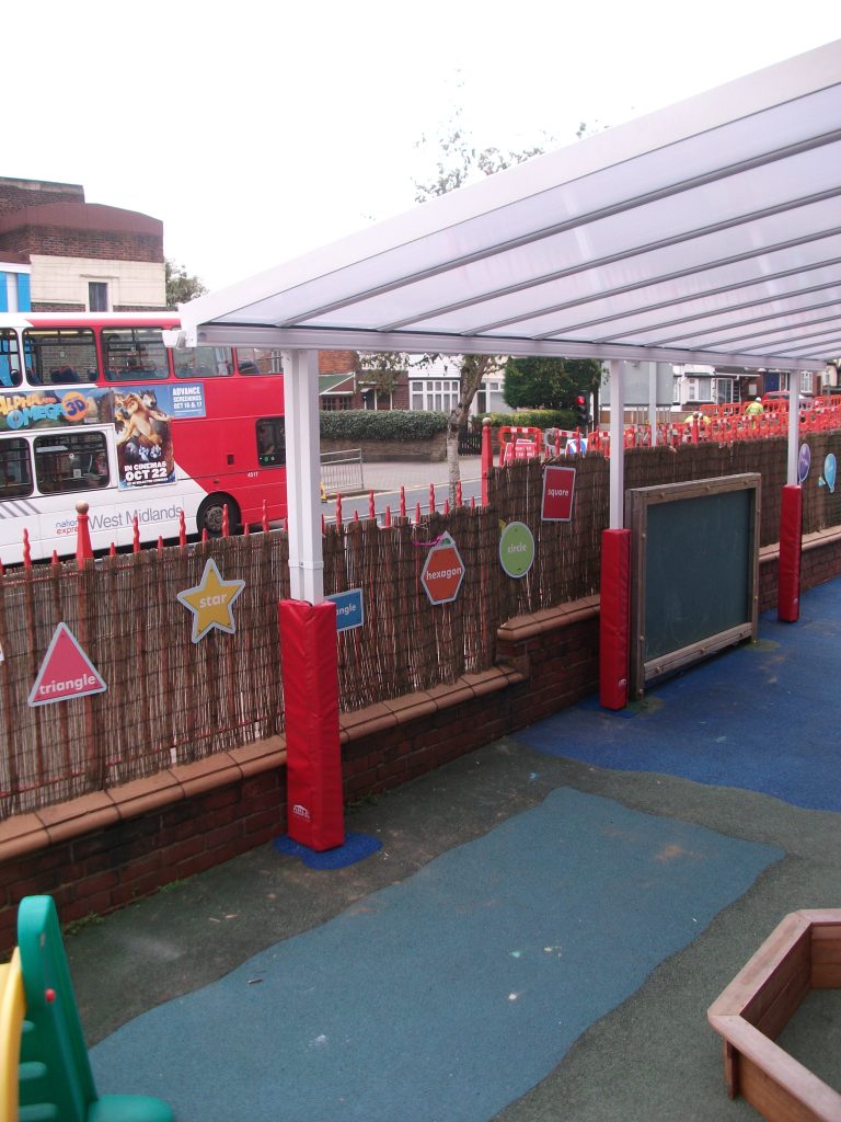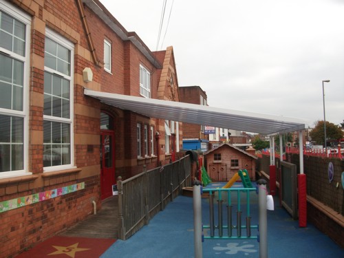 Acocks Green Primary School wanted a structure to create a shaded area at the rear of their school. We supplied and installed a 7m x 5.4m Coniston Wall Mounted Canopy in October 2010, the school chose to have post pads fitted to the structure they chose the colour red which matched the schools surroundings.