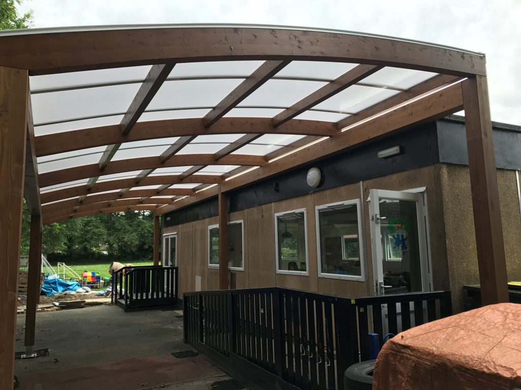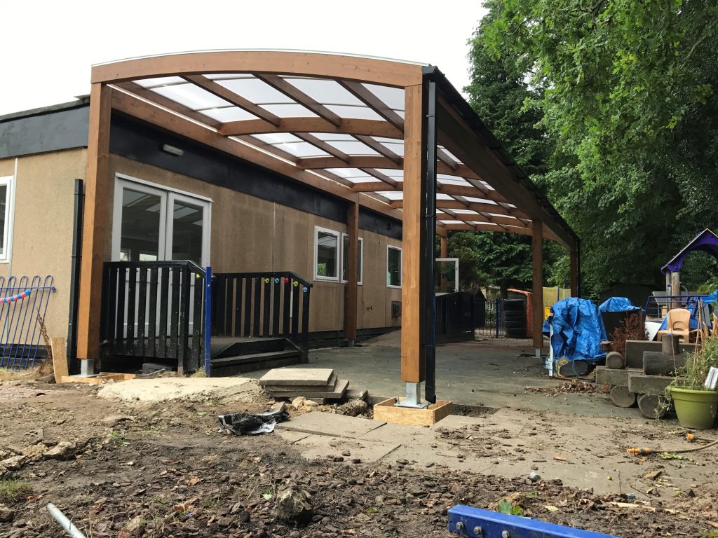 To meet the requirements, we removed their existing canopy and installed a stunning 13.8m x 4m Tarnhow Timber Curved Free Standing Canopy at Acorn under fives which created a large outdoor space that allows the outdoors to be used throughout the year.