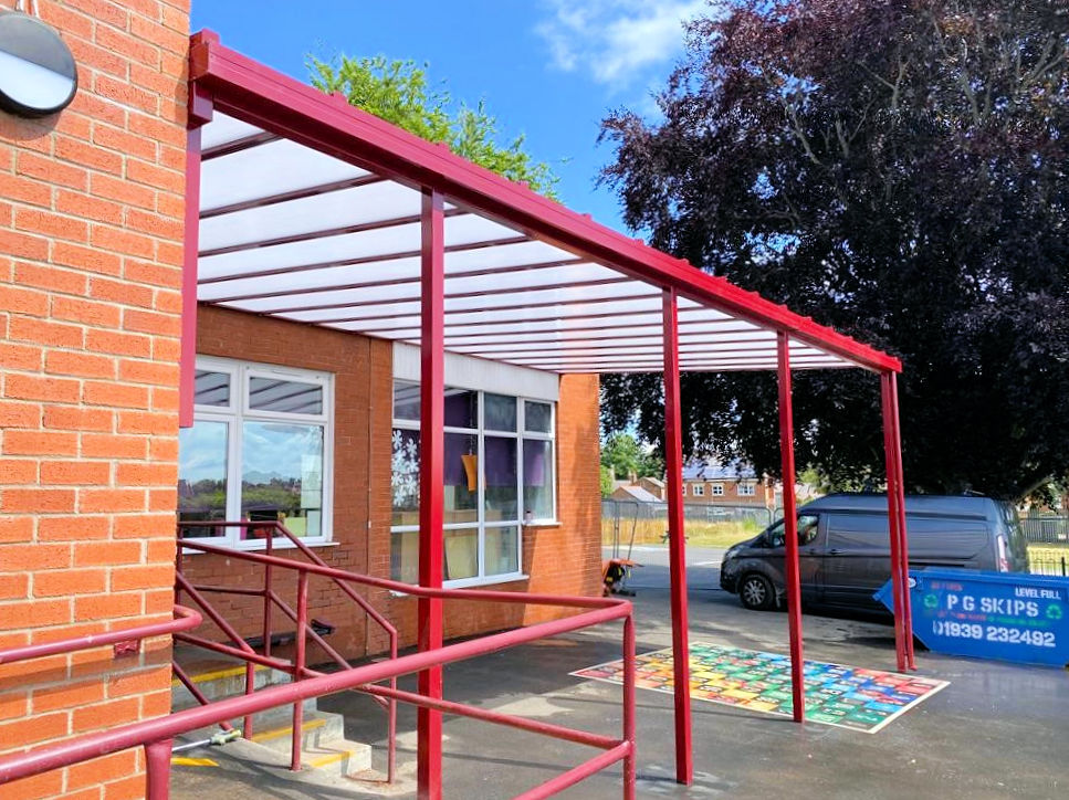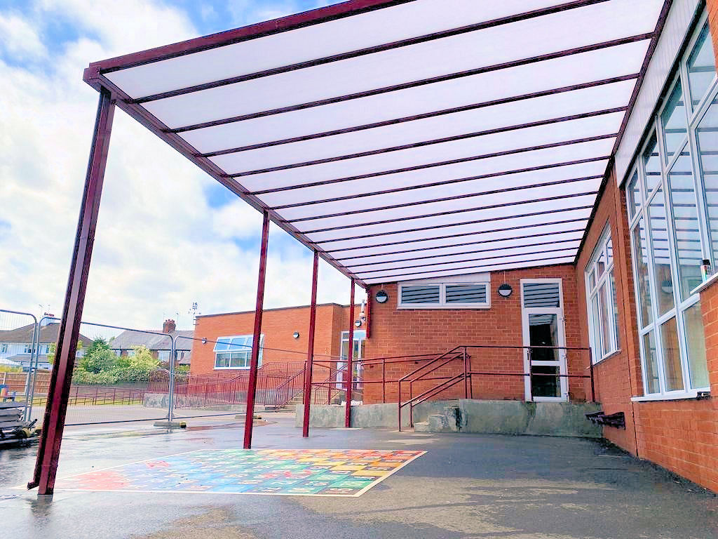 We supplied and installed a 9.5m x 5m Coniston Wall Mounted Canopy meeting the requirements perfectly. The canopy was installed in the colour purple red to match the other surrounds of the school.