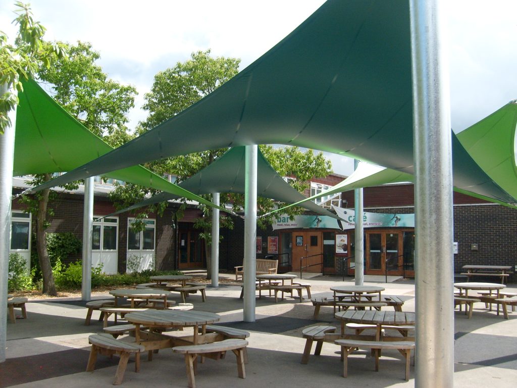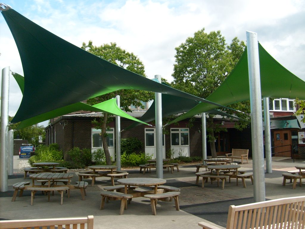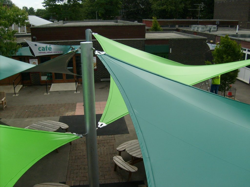 We installed an array of four shade sails, they chose to colour the 5m x 6m sails dark green and light green. The shade sails are made with waterproof tensile fabric that protect against 98.8% of UV rays making them fit in perfectly with requirements and also keeps the outside dining area dry.