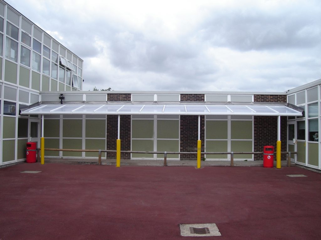 We installed two Coniston Wall Mounted Canopies, a 12.5m x 2m and a 15m x 4m both coloured white with yellow post pads. By adding post pads to the structure it means that pupils will be more aware because of the bright colour, protecting them from bumping into the posts.
