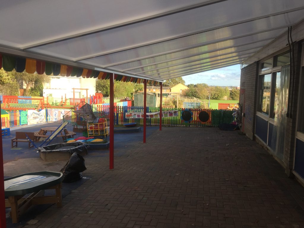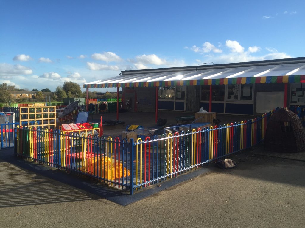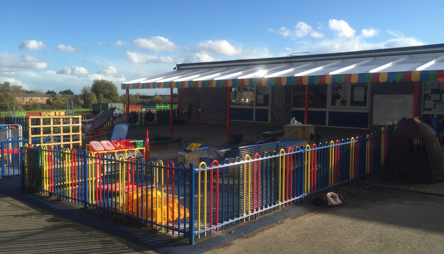 Bardfield Primary & Nursery School contacted us as they required a sheltered area outside their classroom which could be used for outdoor play and learning all year round. They also wanted it to match the bright colours of their existing fencing.