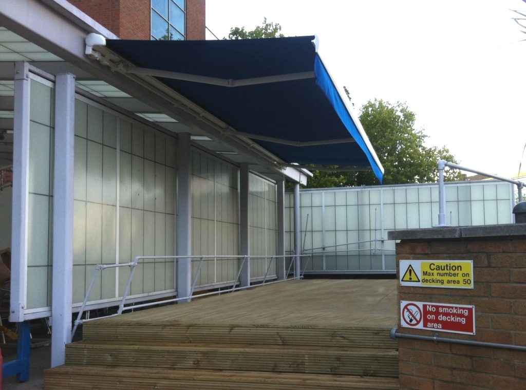 BBC Television Centre wanted a commercial awning to create a sheltered smoking area on a decking area. We installed a 7m x 2.6m Blue Awning which featured their company logo to complete the look.