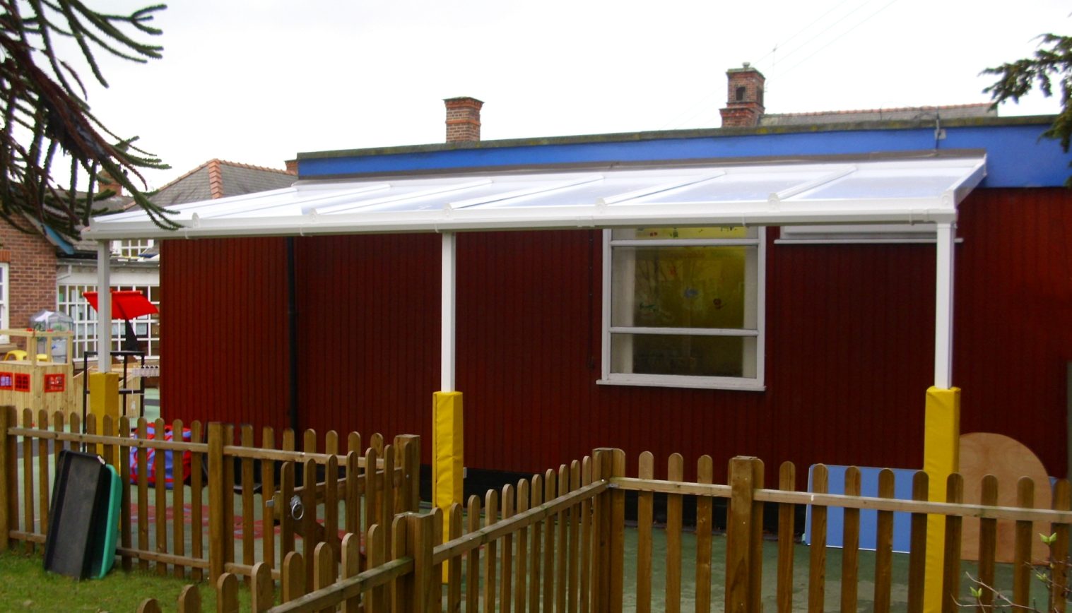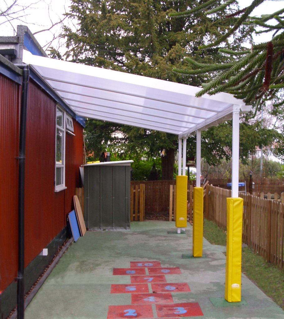 Our installation team installed a 6m x 2.5m Coniston Wall Mounted Canopy at Best Friends Day Nursery to create a sheltered outdoor play area. They chose to have yellow post pads fitted to their canopy making the post easily seen and protect children from bumping into the structure when playing around the canopy.