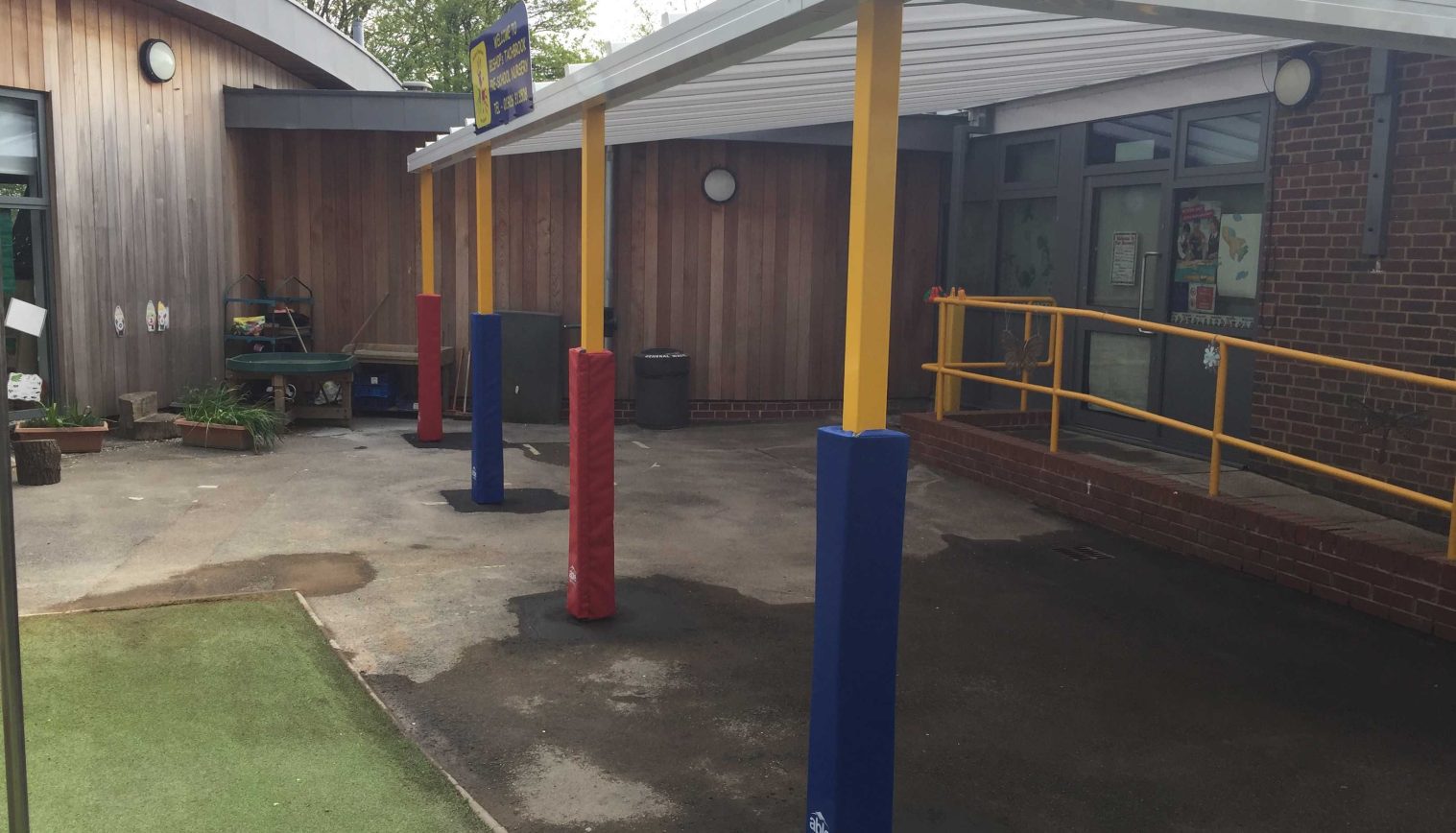 We installed a 8m x 5m Coniston Wall Mounted Canopy with rear steel goal posts to the school playground. They choose the front posts to be coloured signal yellow RAL 1003 and the rear posts grey RAL 7005 to matched the other building surroundings. As optional extra they had an Aluminium Sign with the school logo and details and multi coloured post pads to prevent injuries happening.