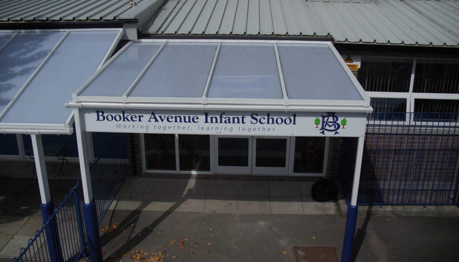 We installed a 3.9m x 2.5m Coniston Wall Mounted Canopy at the reception of Booker Avenue Infant School, adding signage as an optional extra to make the entrance stand out to new visitors.