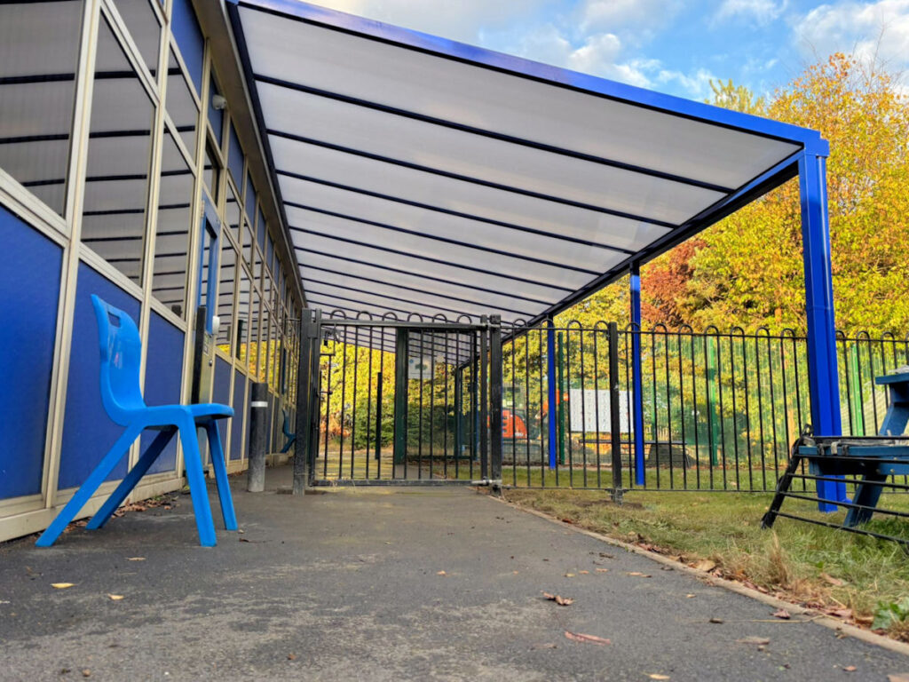 When ordering the canopies, which were 4.9m x 4.2m, 9.7m x 2.6m and 10m x 3.5m, they opted for the canopy frame and posts to be powder coated in Ultramarine Blue (RAL 5002) to match their school branding colours.