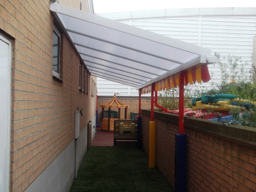 We installed two Coniston Wall Mounted Canopies. One 9m x 2.1m and the other slightly smaller at 8m x 2m. The school chose to add the rainbow package to the canopies as an optional extra. They chose colours red, yellow and blue. The rainbow package is ideal for early years as it is colourful and inspiring for the young children.