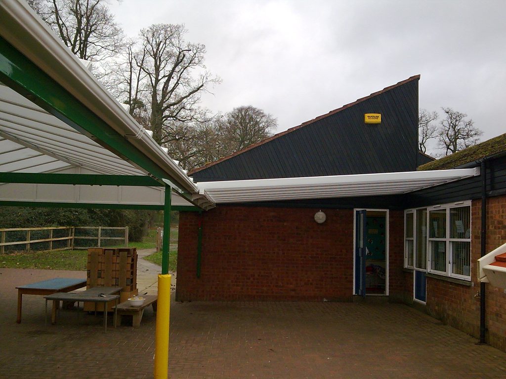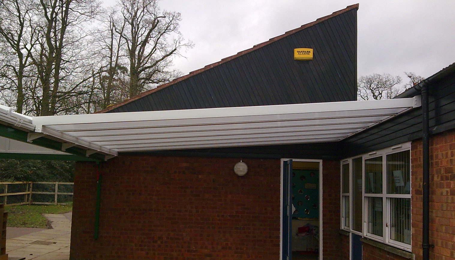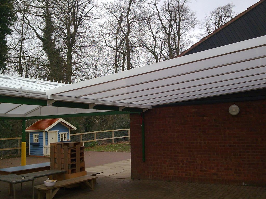 Buckingham Junior School had previously had 3 other canopies installed by Able Canopies. They then contacted us to see if cover could be created between one of their exits and one of the existing free standing canopies.