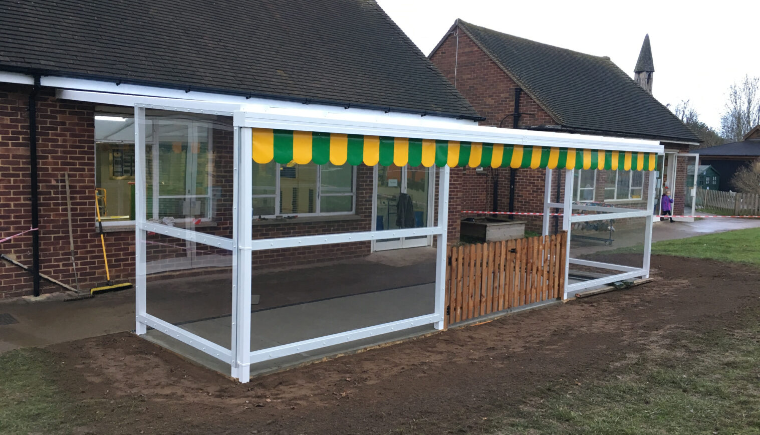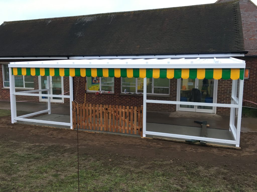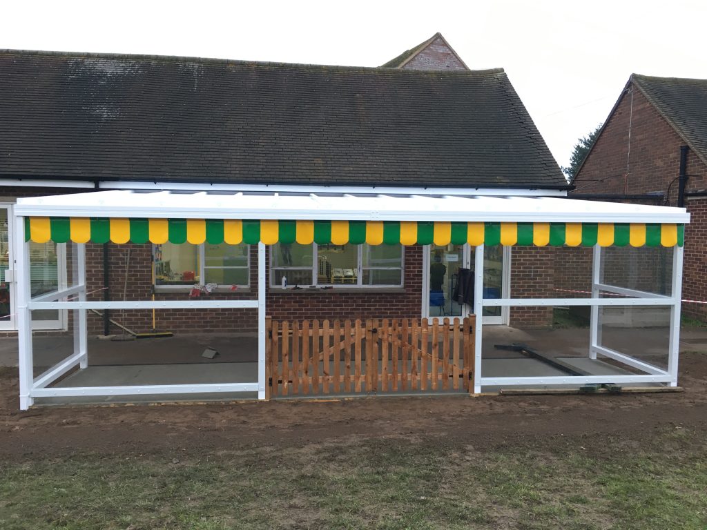 We supplied and installed a 8m x 4.5m Coniston Wall Mounted Canopy, they decided to have front and side fills added to the structure as an optional extra as well as a rainbow banner.