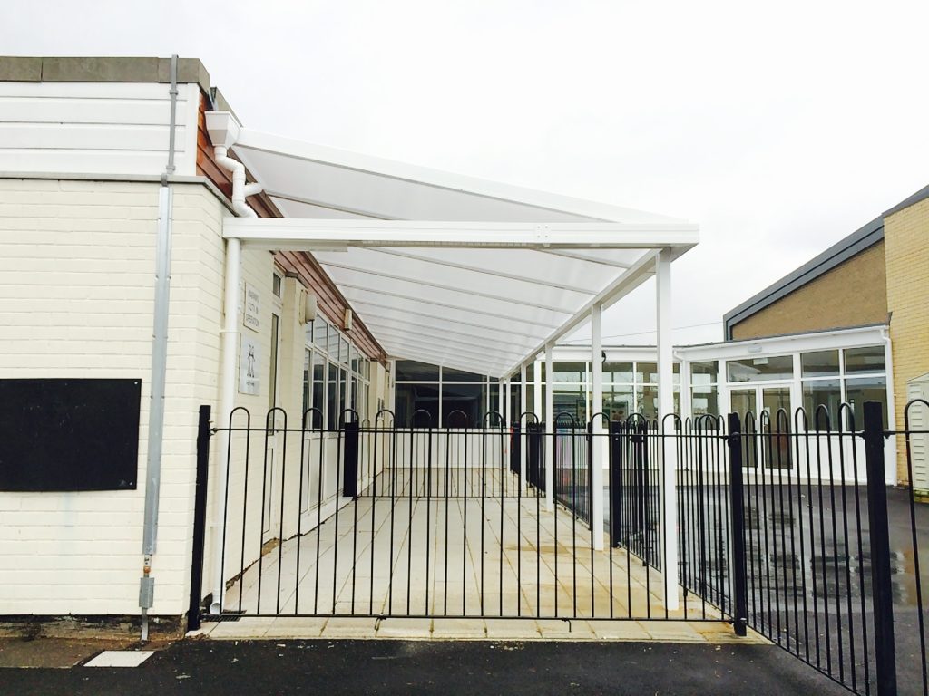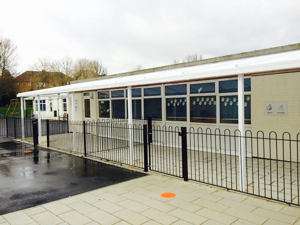 We supplied and installed a 17.6m x 3.05m Coniston Wall Mounted Canopy to meet the school’s requirements of creating a covered walkway to connect the two classrooms and allowing outdoor play in poor weather conditions.