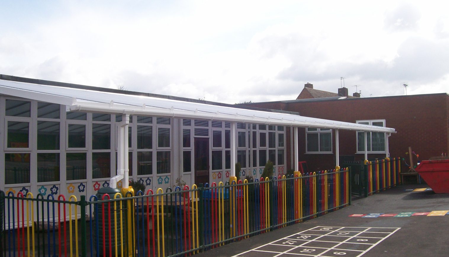 One of our installation teams installed a 16.2m x 4.4m Coniston Wall Mounted Canopy at Castlechurch Primary School creating a covered outdoor area to two of their classrooms. The Coniston offers up to 99% protection from UV rays, helping to ensure the children are protected from the sun whilst playing and learning outside.