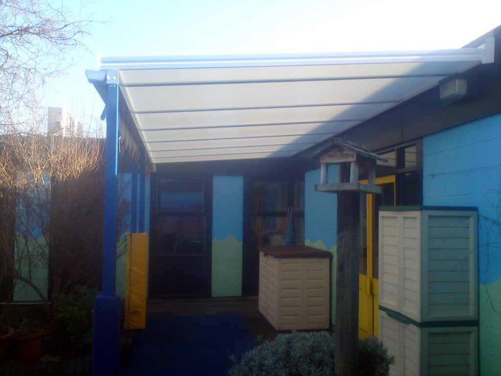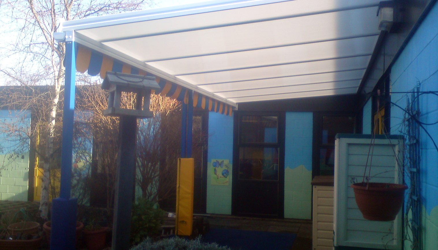 Our installation team installed a 6.5m x 3m Coniston Wall Mounted Canopy at Cauldwell Lower School with the rainbow package as an optional extra. They chose the colours blue and yellow this matched some of the schools surroundings. The Coniston will also help to keep the building’s interior cool by shading windows and deterring unwanted heat.